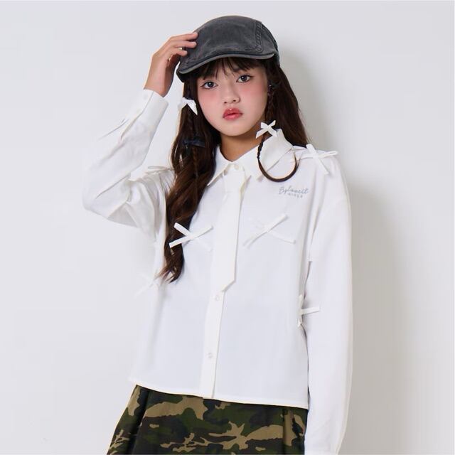 華奢なリボンをたっぷりとちりばめたタイつきのブラウスです。