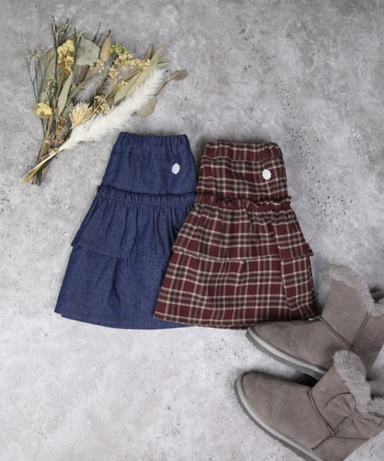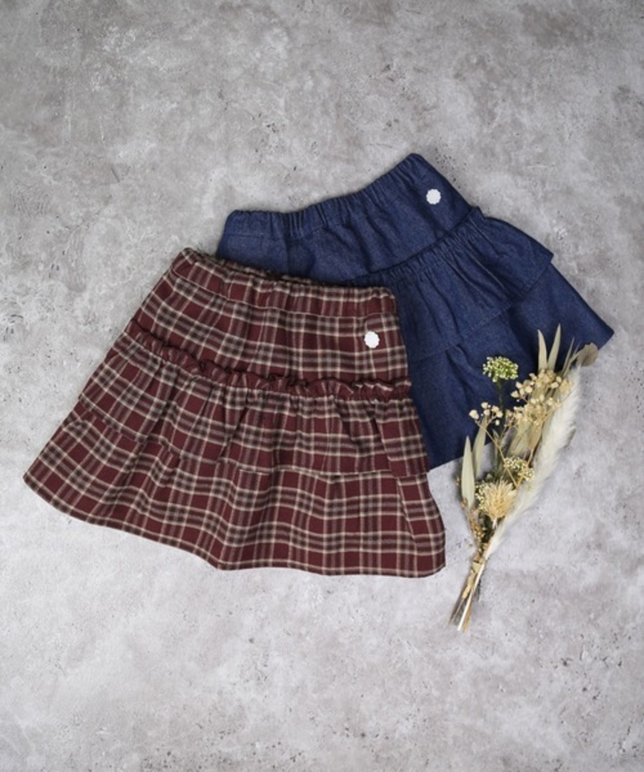 ふんわり広がるティアードシルエットとフリルのデザインで、可愛らしさ満点のアイテムです◎。ウエストは総ゴムで、着脱もらくちんです。チェックとデニム、どちらも秋冬にぴったりの落ち着いたカラーで、コーデに取り入れやすいのがポイント。ポケット付きでちょっとした小物も入れられます。裏地なしの軽やかなつくりで、タイツやレギンスとも好相性です。